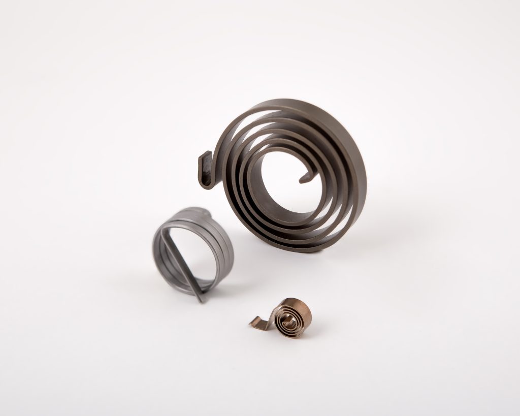 Sprężyny spiralne to elementy wykonane z płaskiej taśmy nawiniętej w kształt spirali. Działają poprzez gromadzenie energii mechanicznej w ruchu obrotowym i jej stopniowe uwalnianie w postaci momentu sprężystego. Doskonale sprawdzają się jako sprężyny kompensujące w mechanizmach wymagających niewielkiego kąta obrotu. Wytwarzana siła może pełnić funkcję stabilizacji, kompensacji lub powrotu do pozycji wyjściowej. Ich charakterystyka pracy zbliża się do liniowej, co ułatwia kontrolę momentu w czasie działania.